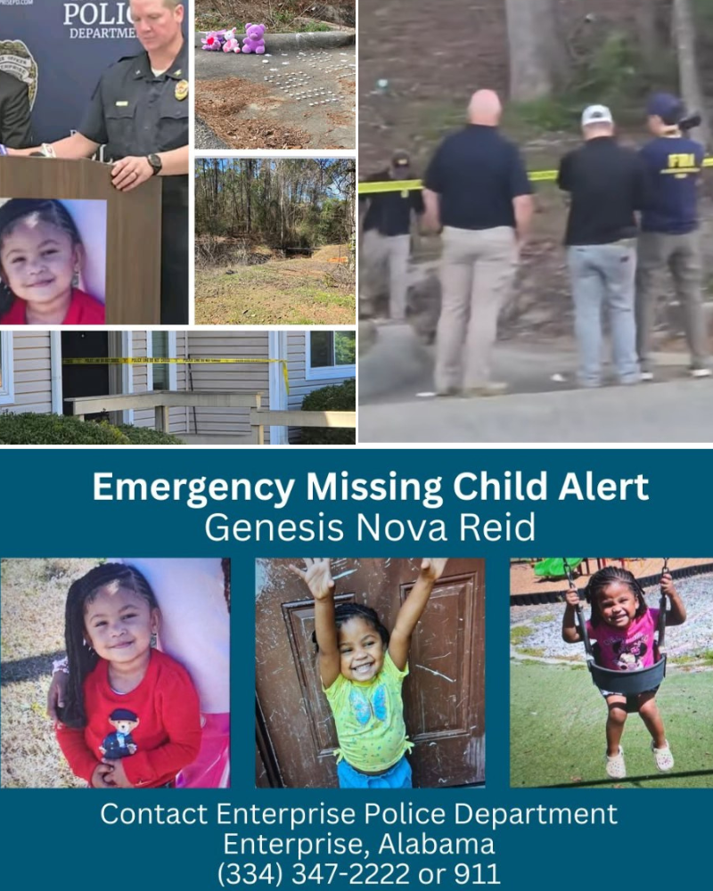 The search for missing toddler Genesis Nova Reid — a 2-year-old from Enterprise — intensified late Saturday after K-9 units alerted on what investigators are calling “potentially significant items” pulled from the woods near her family’s apartment complex. According to officials, the discoveries include a cloth and a small bag, both currently undergoing forensic analysis.