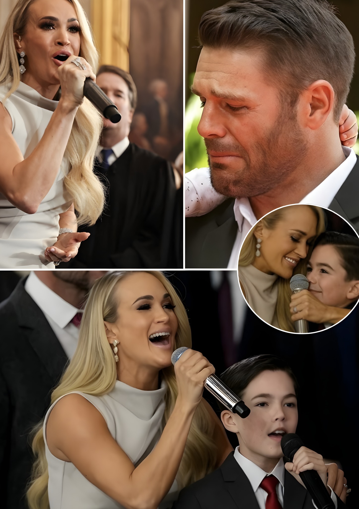 Backstage, moments before stepping into the spotlight, Carrie Underwood knelt beside her son. The microphone felt large in his hands. He held it carefully, his fingers wrapped tight, his confidence steady — but not unshaken.